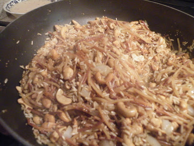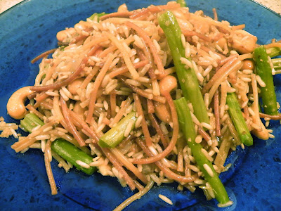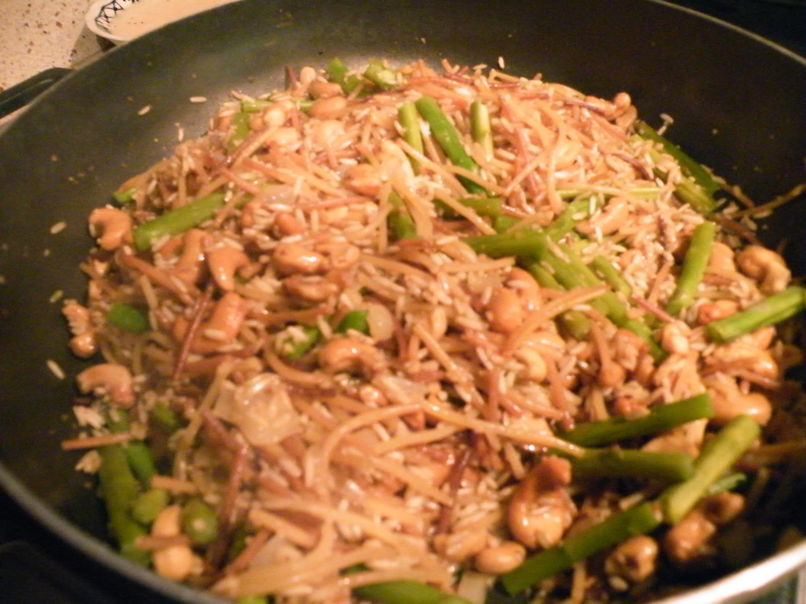 But right now we're making asparagus cashew rice pilaf. So, on with the show! When your rice mixture has been simmering for about 10 minutes and there are 10 minutes left, add about 1 cup of cashew halves. Recover and continue to simmer.