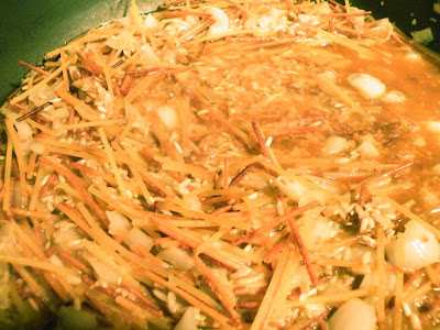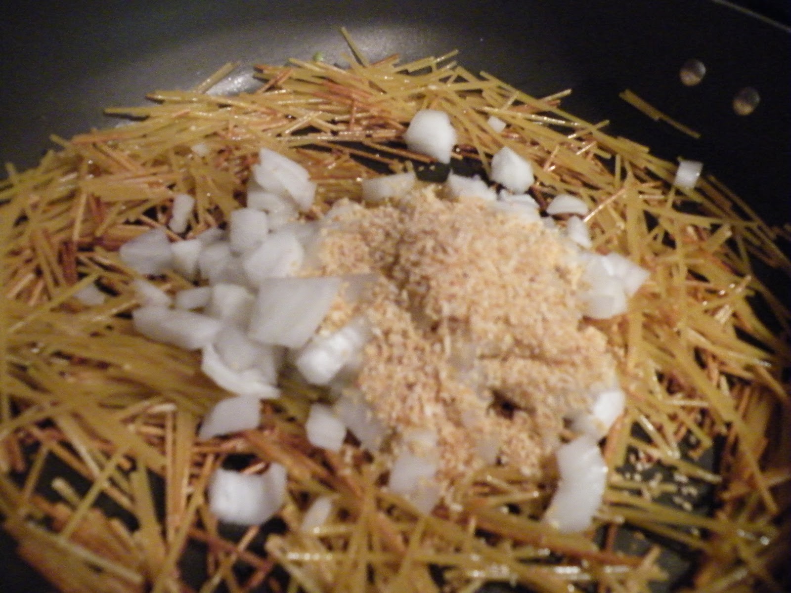 Melt about 2 Tbsp butter in a large skillet I use Smart Balance Lite with Olive Oil. Then take some spaghetti noodles and break them into small pieces. Think Rice A Roni here when you're wondering how small to break the spaghetti.