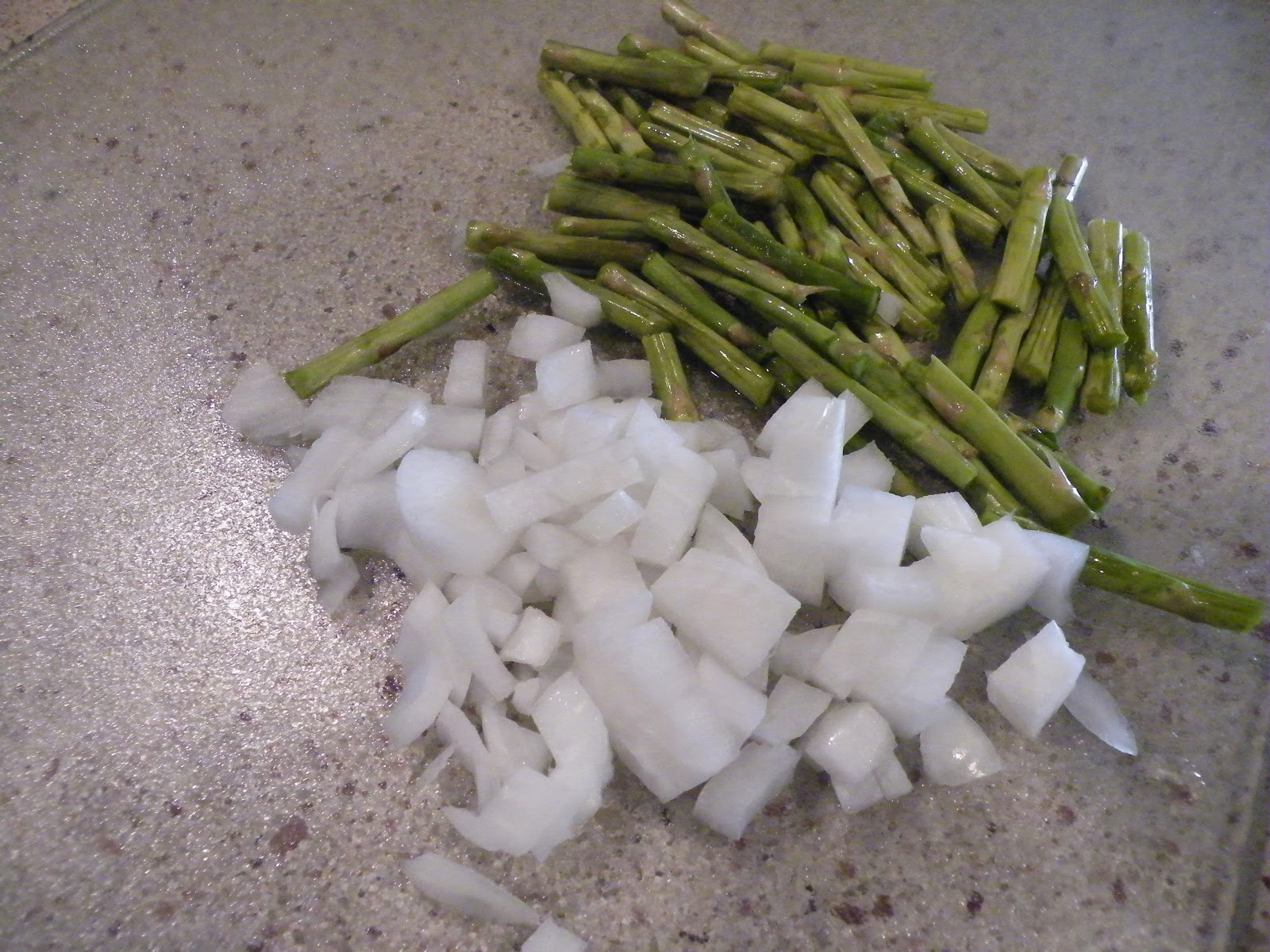 Trim and cut about 1/2 pound fresh asparagus into 2" pieces. Dice about 1/4 cup onion. Slicing and dicing is done. That wasn't too bad was it?