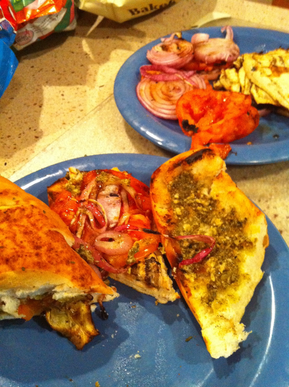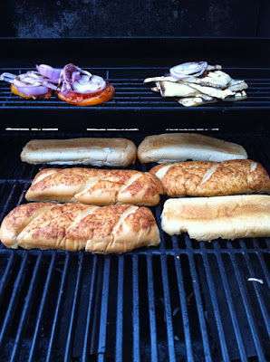 While veggies are grilling, slice choice of bread in half lengthwise and brush olive oil on the insides. Place finished veggies on top shelf of grill to keep warm while you grill the bread. The bread will only take a few minutes.