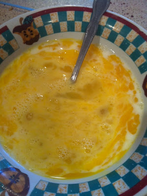Mix 5 eggs and 2 Tbsp milk in a bowl and whisk for a minute. **here's where I would do something different and just make one egg per sandwich (no milk) - whisk one egg and fry in a baby skillet like you were making an egg sandwich. As it is in this recipe (and how I did it this morning, we basically had scrambled eggs falling out of our sandwiches while we ate). Also, keep in mind, one egg per sandwich lowers the calorie count by 20 ;)