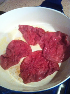 Place your pastrami slices in the melted butter and saute for 2 or 3 minutes on medium heat. They will shrivel slightly, but won't burn or get hard.