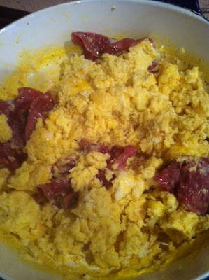 Your egg and pastrami mixture will look like this when it's about done. Again, next time I'm just making egg sandwiches and putting the pastrami and cheese on top.