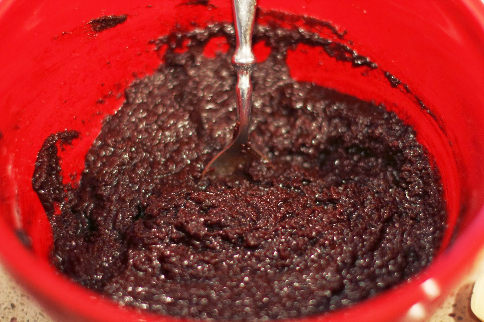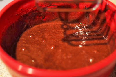 When you take the chocolate and butter mixture out of the microwave, the chocolate pieces will be almost all melted. Stir until they are completely melted and look like this: