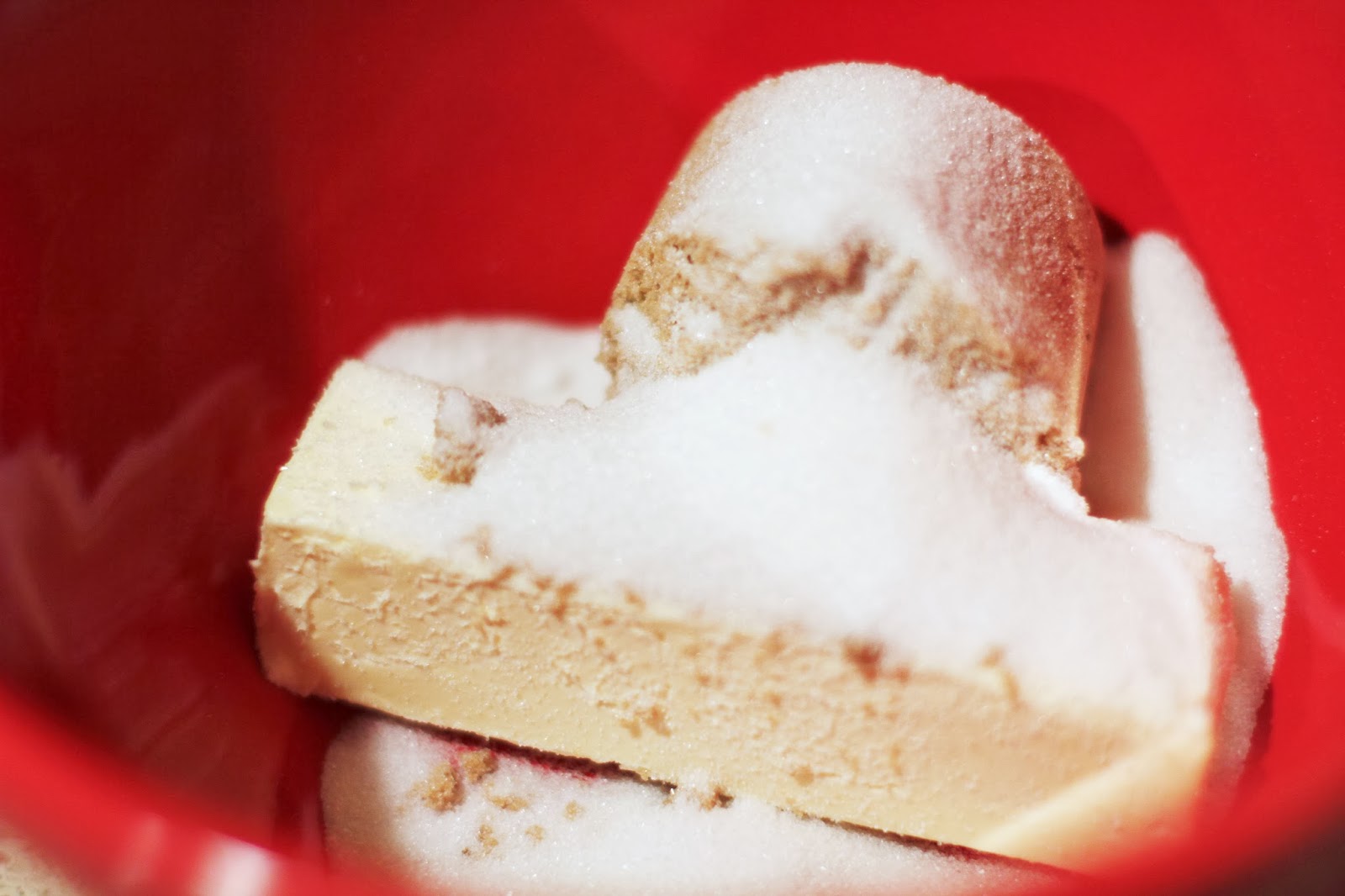 Start by taking a large bowl and placing your stick (1/2 cup) butter, 1/2 cup light brown sugar and 1/4 cup granulated sugar in it