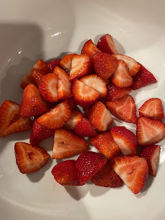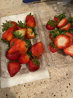 Next up....strawberries! I bought a 2 lb container of organic strawberries - Bossman needed some to munch on, too.