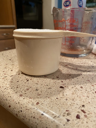 To measure exactly, fill a 1 cup measuring cup with sugar, rounded off, then slide the straight edge of a butter knife over it.