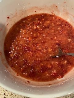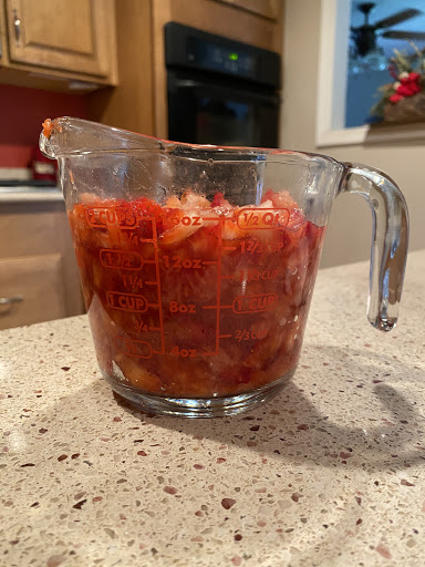 Dice and crush strawberries until you have a good solid 2 cups worth. Then put them back in your bowl.